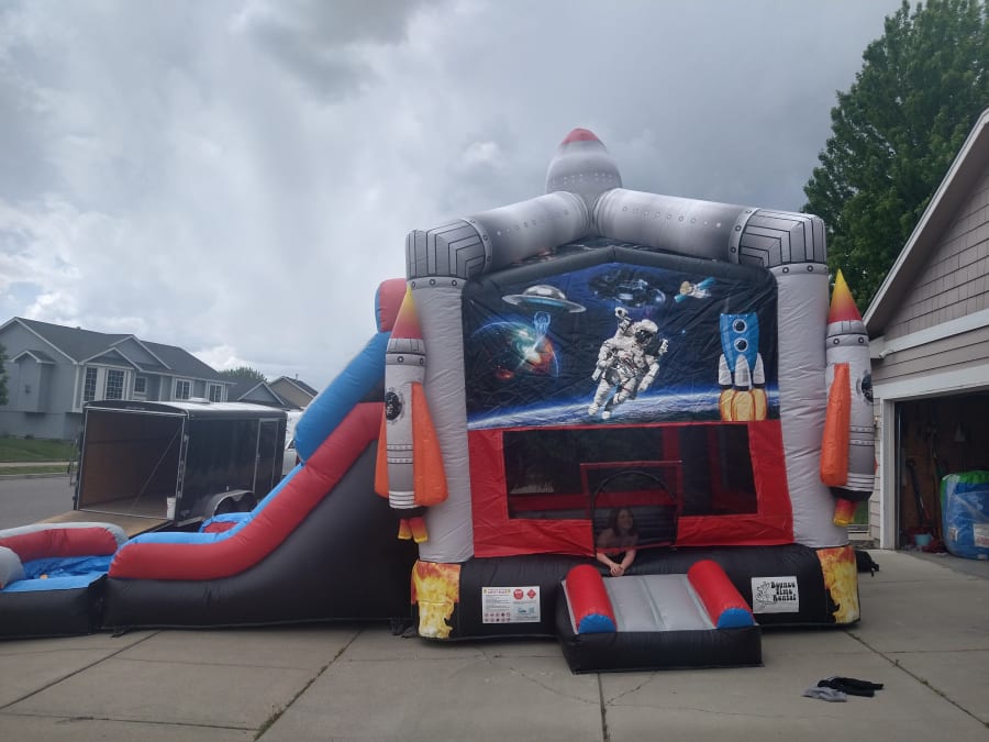 The Space Combo is a deluxe-sized waterslide combo inflatable with a single oversized slide and bounce house and is "out of this world!" Built for thrill and flexibility, this unit combines a roomy bounce area with a high-impact slide that can be used wet or dry. Perfect for backyard parties, school events, and summer festivals, the Space Combo delivers big fun and eye-catching appeal. 🌟💦