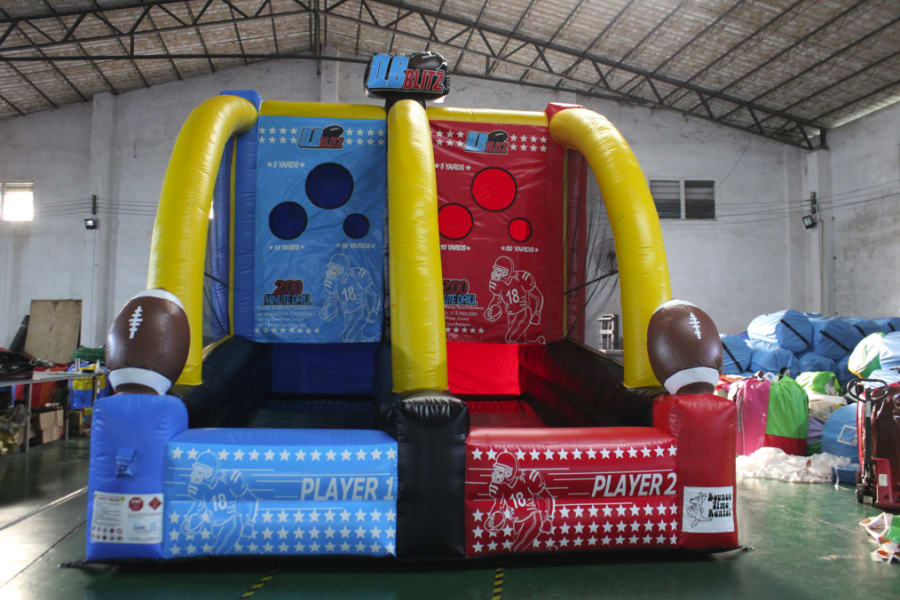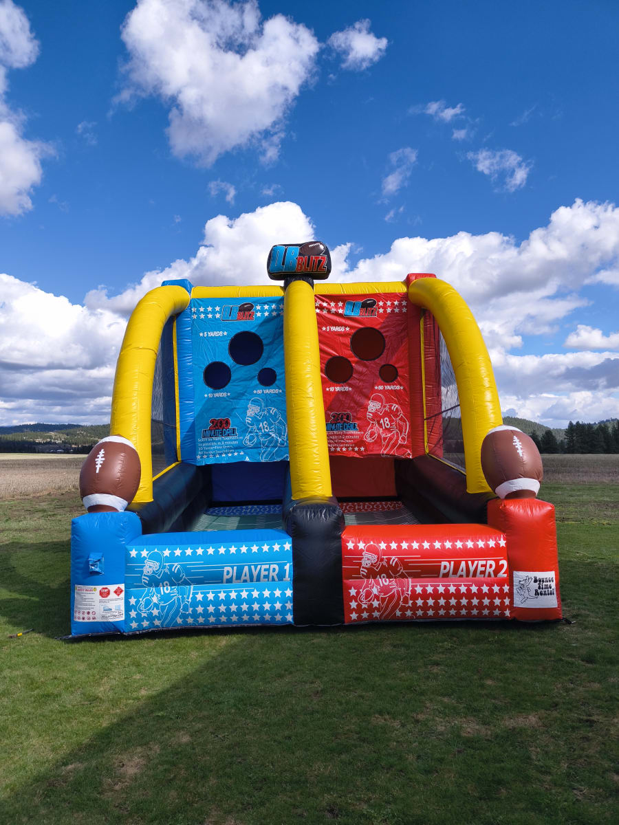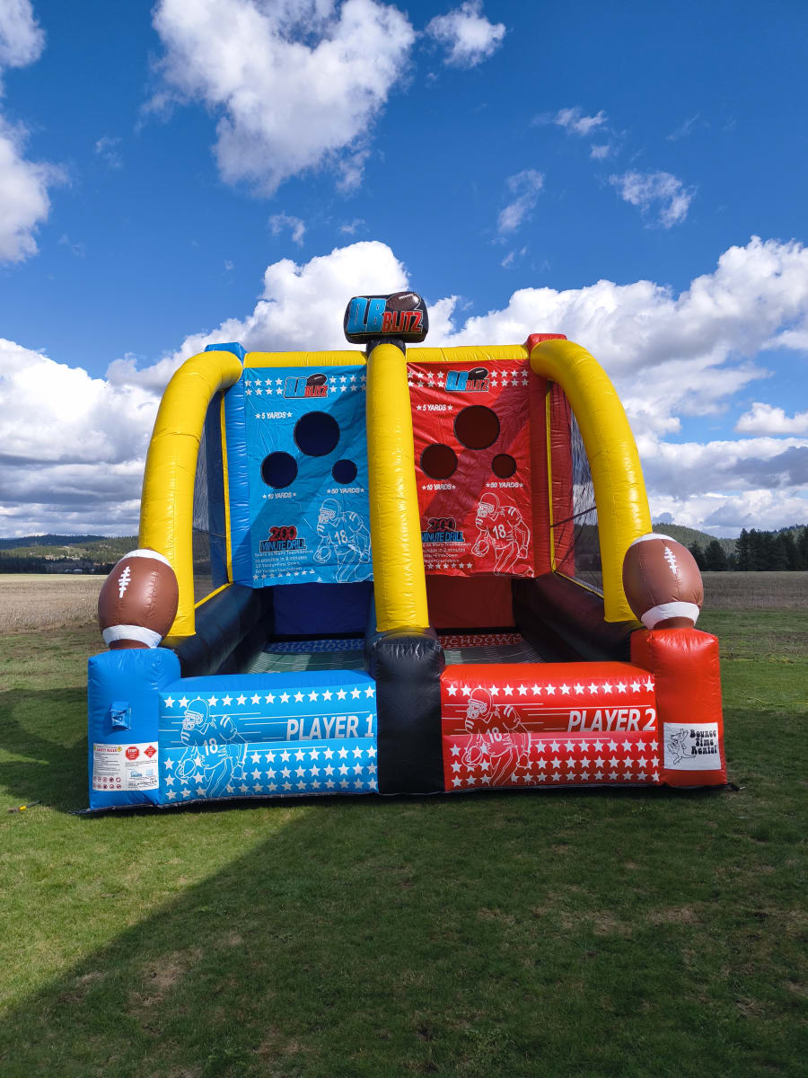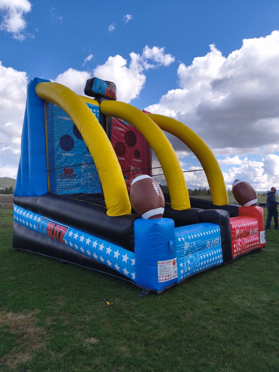 The QB BLITZ Inflatable Game XL delivers head-to-head excitement with a dual lane football throw. Fast setup and intense competition make it ideal for birthdays, teams, special events, and tailgates. This is a large inflatable game that will require a 16'+ ceiling clearance than our other games which are more compact. Perfect for small or large groups craving competitive fun. ๐