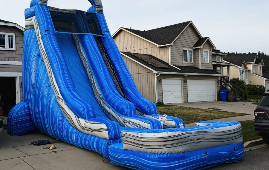 Make any event unforgettable with the 22' Blue Rush Water Slide. This 22-foot water slide is a showstopper. Guests race down and splash into the pool at the bottom. Our team thoroughly tested it and recommends it for backyard parties and community events. Dimensions: 30L x 10W x 22H. Fast setup. Big fun. 🎉